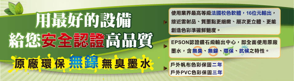 关于皓远 About HYO YUAN 皓远影像集成输出公司成立三十年,至今讲求输出品质、时间效率及对客户 户的信用,而皓远多元化的经营理念,更能为客户做全方位的服务。 本公司已拥有数十台专业高解析大型 海报喷画机、HP工业级双喷帆布机、 HP大型平板UV机、瑞士进口ZUND大型平 台切割机及EPSON八色输出机等... 集成输出所有形式及材质,从室内海报至户外大型帆布、双喷无接缝招牌一 应俱全,让您有更多选择及服务。 本公司更自设工厂,无需外包,从接单到后制加工一贯作业,让您感受到更 方便完整的服务,呈现最完美的品质。........... - 档